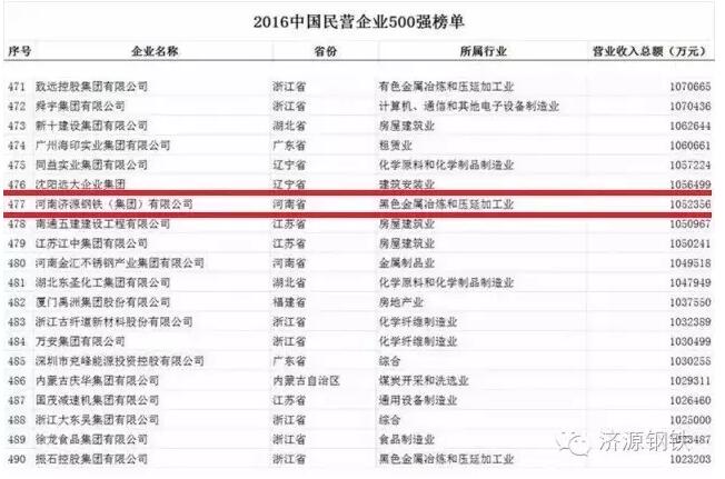 8月25日,全國(guó)工商聯(lián)發(fā)布“2016中國(guó)民營(yíng)企業(yè)500強(qiáng)”榜單,濟(jì)源鋼鐵上榜,位居477位。
